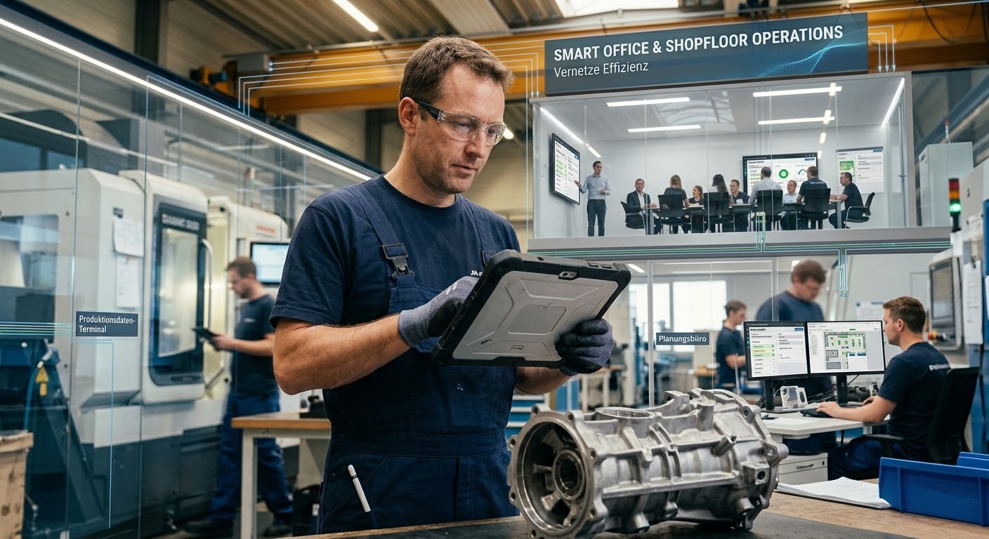 Wahre Produktivität entsteht dort, wo Information ohne Reibungsverlust fließt. Wir verknüpfen Ihr Backoffice direkt mit der Werkshalle oder der Baustelle. Schluss mit Klemmbrettern, Zettelwirtschaft und manueller Dateneingabe.